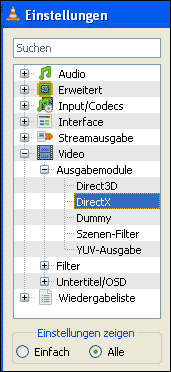 4) Dann wählt man unter dem Punkt „Ausgabemodule“ im Drop-Down-.Menü „DirectX Videoausgabe“ als Videoausgabe-Modul fest.