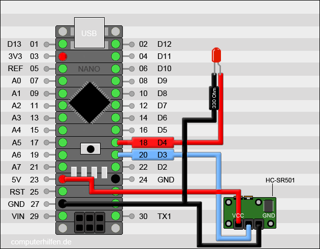 Der Bewegungsmelder HC-SR501 ist dabei sehr genau und mit 3-5 EUR sehr günstig über Amazon oder eBay zu bekommen: Dazu braucht man neben dem Arduino (in unserem Beispiel der Arduino Nano) nur noch eine LED + Widerstand (siehe auch: LED am Arduino anschließen), fünf Jumperkabel und eine Steck-Platine.