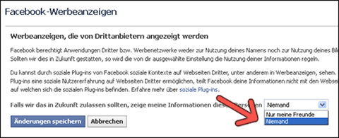 Facebook selbst spricht zwar davon Namen und Bilder nicht an Werbetreibende weiterzugeben; spricht aber ebenfalls davon: „Facebook berechtigt Anwendungen Dritter bzw. Werbenetzwerke weder zur Nutzung deines Namens noch zur Nutzung deines Bildes für Werbeanzeigen. Sollten wir dies in Zukunft gestatten, so wird die von dir ausgewählte Einstellung die Nutzung deiner Informationen regeln.“