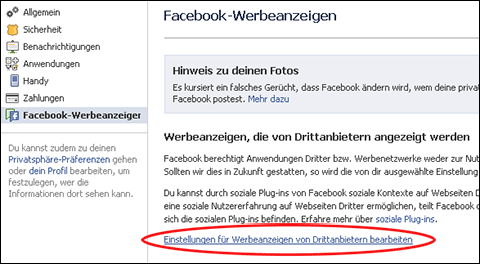 Um die Einstellung der Werbung zu ändern muss man unter „Kontoeinstellungen – Facebook-Werbeanzeigen“ auf den Link zu „Einstellungen für Werbeanzeigen von Drittanbietern bearbeiten“ klicken.
