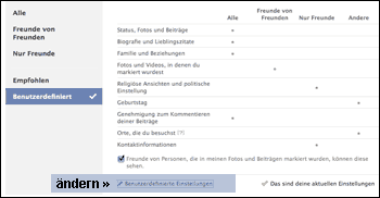 In den Einstellungen lassen sich über den Punkt „Benutzerdefinierte Einstellungen“ die automatischen Facebook-Einstellungen abändern.