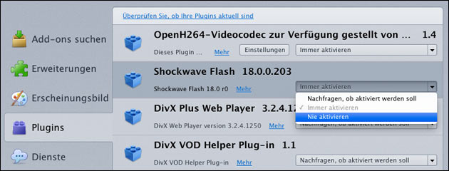 Firefox Plugins deaktivieren (z.B. Flash Player)