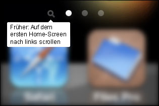 Bei den älteren iOS Versionen bis iOS 6 sucht man auf dem iPhone oder iPad, indem man auf dem ersten Home-Bildschirm noch einmal nach links scrollt: Hier erscheint dann das Eingabefenster, um den Suchbegriff einzugeben. Wie auf dem Bild oben zu sehen befinden sich am unteren Bildschirmrand kleine weiße und graue Punkte: Ein Punkt für jeden angelegten Home-Bildschirm. Der weiße Punkt symbolisiert dabei den gerade aktiven Bildschirm – hier der ganz linke. Von diesem Bildschirm aus erreicht man jetzt mit einem weiteren Wischen nach links die Suche, dargestellt durch eine kleine Lupe.