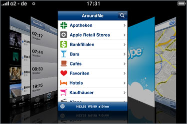 Der Nachteil: Der Platz für die aktuelle Anwendung wird dadurch reduziert, abhängig von der Anzahl der gleichzeitig laufenden Apps. Dreht man im Home-Menü, auf dem die Icons aller Apps angezeigt werden, das iPhone um 90°, könnte in einer Coverflow-Darstellung durch die laufenden Programme gescrollt werden: So lässt sich im iPod Programm bereits bequem das nächste Lied auswählen.