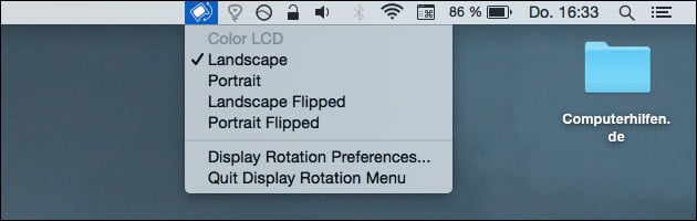Möchte man also den Bildschirm von MacBook und iMac drehen, braucht man ein zusätzliches Programm: Zum Beispiel das kostenlose „Display Rotation Menu“ von Mage Software, das ab Mac OS 10.4 funktioniert. Nach dem Download (Tipp: So startet man ein Programm, das nicht üder den App Store geladen wurde!) blendet das Programm ein kleines Icon oben rechts im Apple-Menü ein: Mit einem Klick lässt sich dann der Bildschirm drehen, die Auflösung wird dabei angepasst.