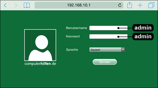 Auf der nun erscheinenden Seite kann man zunächst die Sprache auf Deutsch wechseln und sich dann auf der Webseite anmelden: Benutzername und Passwort sind beim ersten Start jeweils „admin“ (kleingeschrieben und ohne Anführungszeichen).