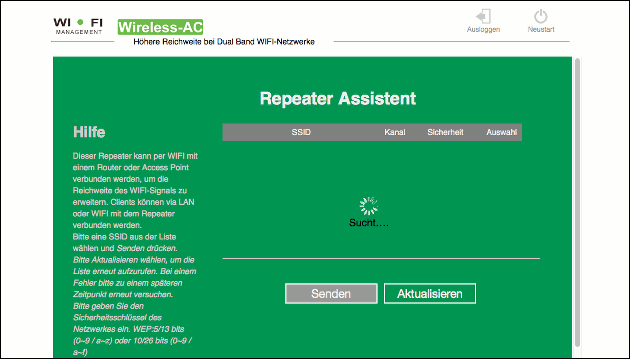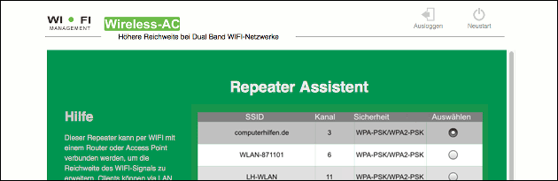 Auf der nächsten Seite lassen sich die Einstellungen vornehmen. Um das eigene Netzwerk schnell und einfach zu erweitern, klickt man dazu auf „Repeater Assistent“ oben links: