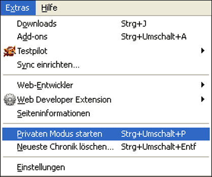 Nun gibt es aber die Möglichkeit eine private Session zu starten. Entweder indem man die Tastenkombination strg + shift + p drückt oder unter, beispielsweise bei Firefox und Internet Explorer, „Extras“ via Klick den privaten Modus startet. Aber auch bei Safari und Chrome gibt es die Funktion.