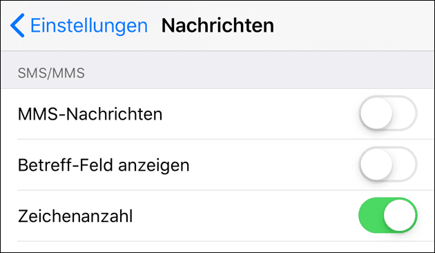 Unter neueren iOS Versionen sieht das Einstellungs-Fenster zwar etwas anders aus, die Einstellung zum Aktivieren des Zählens der SMS Zeichen befindet sich aber weiterhin direkt in der Einstellungs-App unter dem Punkt „Nachrichten“: