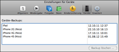 Die erstellten iTunes Backups werden in iTunes angezeigt, wenn man die Einstellungen öffnet und dort auf Geräte klickt: