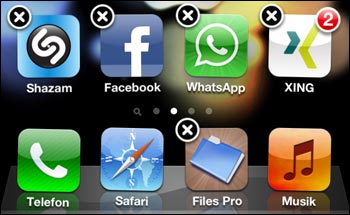 Zum Entfernen einer App muss das Programmsymbol einige Sekunden lang gedrückt gehalten werden. Dann erscheint auf der linken Seite bei den App-Symbolen ein X. Wird das X geklickt, kann die Anwendung entfernt werden.