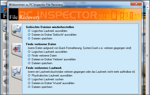 PC Inspector ist ein kostenloses Programm der Firma Convar zum Retten und Wiederherstellen von gelöschten Daten. PCInspector unterstützt neben Bild-Daten unter anderem die Dateiformate AVI, DOC, HTML, PDF, MP3 und ZIP. (Anleitung zum Daten retten mit dem PC Inspector)