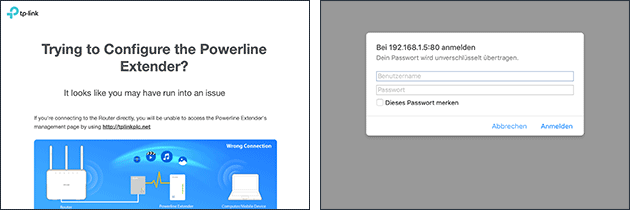 Wird statt dem Anmelde-Fenster eine Hinweisseite (hier auf dem Bild links dargestellt) angezeigt, funktioniert das so nicht: Der Extender erkennt nicht, dass er die eigene Weboberfläche öffnen soll und leitet die Anfrage an den Router und ins Internet weiter: