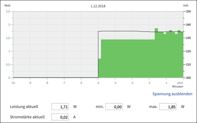 Selbst Bei der Musik-Wiedergabe, hier bei Lautstärke 5 (oder 50%), verbraucht der Echo Dot nicht viel Strom: Etwa 1,7 Watt verbraucht der kleine Lautsprecher als Radio-Ersatz mit aus dem Web gestresster Musik.