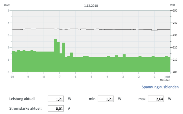 Nach dem Booten (hier verbraucht der Echo Dot 3 kurzzeitig deutlich mehr Strom) pendelt sich der Standby Verbrauch des Echo Lautsprechers der dritten Generation bei 1,2 Watt ein: Damit verbraucht er sogar noch weniger als der Vorgänger im Standby-Betrieb.