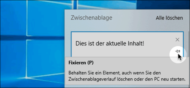 Hat man den Verlauf aktiviert, kann man später mit den Tasten Windows + V auf die einzelnen Elemente der Zwischenablage zugreifen, die einzeln löschen oder festpinnen. Die Tastenkombination STRG + V fügt weiterhin immer nur das letzte Element der Zwischenablage ein: Hier hat sich nichts geändert gegenüber früheren Windowsversionen.