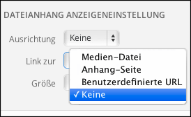 Leider merkt sich WordPress nicht die letzte Auswahl von dem Punkt „Link zur“ unter „Dateianhang Anzeigeneinstellung“. Hier hat kann man die Ausrichtung des Bildes angeben, die Anzeige-Größe des Bildes und wohin ein Link auf das Bild führen soll. Zur Auswahl stehen hier „Medien-Datei“ (also das Bild selbst), „Anhang-Seite“, „Benutzerdefinierte URL“ und „Keine“.