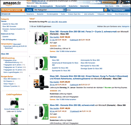 Saturn hatte in zahlreichen Werbe-Anzeigen auf die Preissenkung für den heutigen Montag hingewiesen, auf der Amazon-Webseite sieht man von der Aktion zunächst nichts: Erst wenn man sich zu den Spiele-Konsolen durchklickt, wird das Angebot unter mehreren anderen Versionen der Xbox aufgeführt.