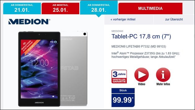 Für viele Käufer dürfte das kleine Tablet aber vor allem wegen des Preises interessant sein: Aldi Nord bietet das Tablet ab morgen für 99,99 EUR an, was für ein Android Tablet mit hochwertigem Metallgehäuse und schnellem Intel-Prozessor sehr günstig ist – und noch einmal 10 EUR weniger, als das Tablet noch im November kostete. Wer das Aldi-Angebot verpasst hat, bekommt das Tablet als „P7331“ für 129,- EUR auch im Medion Online-Shop – allerdings mit nur 8GB internem Speicher, dafür bereits mit einer mitgelieferten 32GB Speicherkarte. Wem das 7″ Tablet zu klein ist, findet bei Medion auch die etwas größere 8″ Variante „Lifetab P8311“ für ebenfalls 129,- EUR.