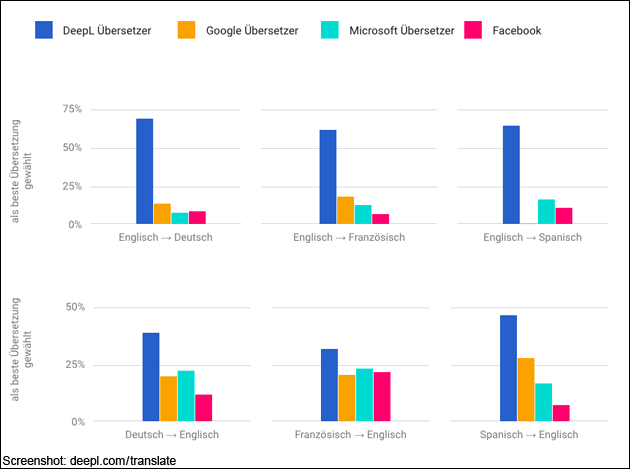 Besonders groß war im Blindtest der Abstand von DeepL zu Google, Microsoft und Facebook bei Übersetzungen aus dem Englischen ins Deutsche, den geringsten Vorsprung hatte DeepL bei Übersetzungen aus dem Französischen ins Englische. Aber auch im BLEU Test, einem Wert für spezielle, festgelegte Testsets zur Ermittlund der Güte der Übersetzungssysteme lag DeepL deutlich vor der Konkurrenz.