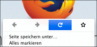 Beim Kontext-Menü, das sich beim Klicken mit der rechten Maustaste öffnet, haben die Firefox Entwickler jetzt eine zusätzliche, praktische Navigations-Leiste eingebaut: Hier befinden sich jetzt noch einmal die vier wichtigsten Buttons aus der oberen Navigationsleiste.