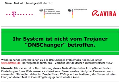 Die Webseite prüft, mit welchen Einstellungen sie aufgerufen wurde – bei einer Infektion mit dem DNS Changer Virus wird eine Warnmeldung ausgegeben.