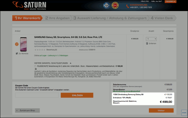 Zu den heutigen Highlights der Saturn Black Week dürfte aber sehr wahrscheinlich das Samsung Galaxy S8 zählen: Das erst im Frühjahr 2017 vorgestellte Smartphone kostete ursprünglich über 700 Euro – heute ist es bei Saturn für 499,- EUR zu haben: Auf den angezeigten Aktionspreis von 599,- EUR gibt es noch einmal 100 EUR Rabatt, der direkt im Saturn-Warenkorb abgezogen wird.