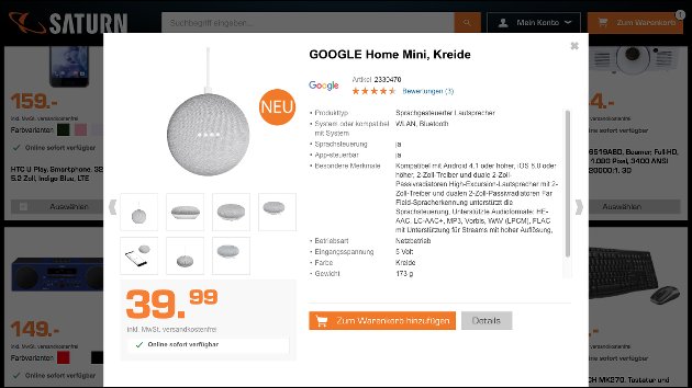 Während Amazon gerade im Rahmen der Cyber-Monday-Woche 2017 seine smarten Echo-Lautsprecher reduziert hat, gibt es den smarten Google Lautsprecher aktuell ebenfalls günstiger: Mit 39,99 (Update: Saturn hat den Preis im Laufe des Vormittags auf 34,99€ gesenkt!) ist der erst im Oktober erschienene Google Home Mini mit Googles eigenem Sprach-Assistenten aktuell bei Saturn 25 Euro günstiger als regulär und wird sogar versandkostenfrei aus dem Onlineshop geliefert.