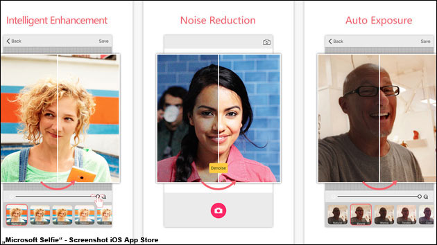 Eine weitere App zum Selfies machen – wer braucht das? Schließlich geht das mit der normalen Kamera-App doch auch recht gut? Trotzdem ist Microsofts kostenlose App „Microsoft Selfie“ zur Zeit einer der Top-Vorschläge in Apples iPhone-App-Store – und es gibt gute Gründe, warum die Selfie App so beliebt ist: Zum einen ist sie kostenlos – zum anderen wartet sie mit zahlreichen zusätzlichen Funktionen und Filtern auf, um das Beste aus einem Selbstportrait herauszuholen. Dabei nutzt Microsoft einige Technologien aus seinen eigenen Software-Laboren, um unter anderem das Alter, das Geschlecht und den Hautton möglichst genau auf dem Bild zu erkennen – und dann mit „Intelligent Enhancement“ diese Bereiche heimlich aufzuhübschen, ohne dass der Rest des Bildes darunter leidet. Das ist nämlich schnell der Fall, wenn man die Haut im Gesicht per Software zu weich zeichnet: Feine Strukturen wie die Haare verschwimmen dann oft ebenfalls.