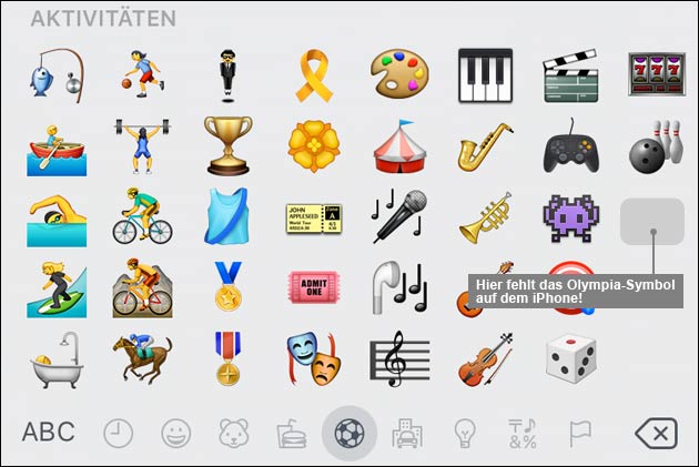 Auf dem iPhone ist der Platz aber leer, hier ist das Verschicken des Olympia-Symbols etwas schwieriger: Man kann das Symbol nur verschicken, wenn man es vorher kopiert hat – entweder aus einer anderen Nachricht oder hier von unserer Seite!